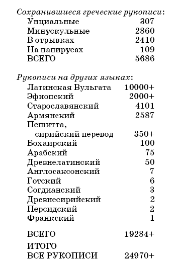 Ли Стробель в своей последней книге (опубликованной в 1998 году) сообщает самые новые данные о греческих рукописях Нового Завета. Папирусов девяносто девять; унциальных текстов триста шесть; минускульных текстов две тысячи восемьсот пятьдесят шесть; текстов лекционарий в количестве две тысячи четыреста три, и всего пять тысяч шестьсот шестьдесят четыре (Strobel, СС, 62–63). (Следует, однако, отметить, что возможны небольшие расхождения в цифрах в зависимости от того, какие фрагменты считались за отдельную рукопись. Эти «горы свидетельств» придают Новому Завету огромную историческую достоверность.)