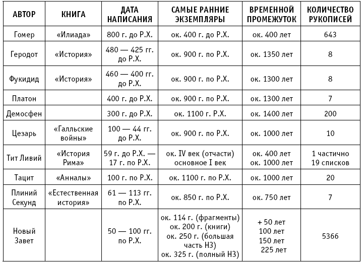 Самые древние из известных рукописей большей части греческих классиков появились через тысячу и более лет после смерти своих авторов. Временной интервал для римских авторов несколько меньше и варьируется, но как минимум составляет три столетия, как в случае с Вергилием. Что же касается Нового Завета, то две самые важные рукописи были написаны не позже чем через триста лет после завершения Нового Завета, и некоторые практически полные новозаветные книги, равно как и рукописи многих частей Нового Завета, сохранившиеся во фрагментах, отделены от времени создания оригинала всего одним столетием (Greenlee, ШТТС, 16).