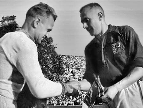 27 июня 1937 г. Москва. Стадион «Динамо». Рукопожатие капитанов. Капитаны команд «Динамо» (Москва) Сергей Ильин (слева) и сборной Басконии (Испания) Луис Регейро. Баски тогда считались европейскими футбольными грантами