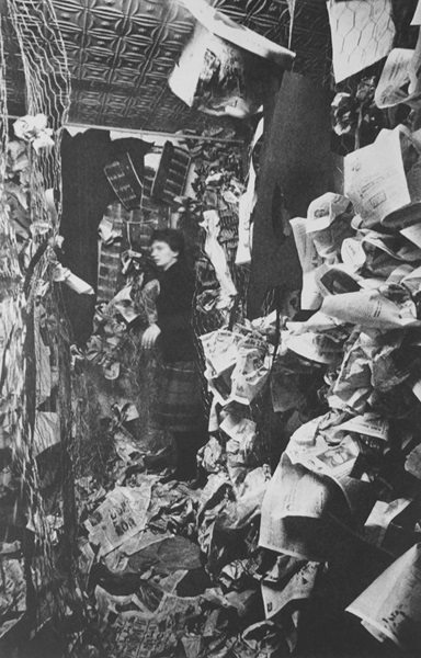 Этот энвайронмент был создан из проволочной сетки, порванного на куски картона, лоскутов ткани, рубероида и огромного количества порванных и смятых газет, которые заполнили ячейки проволочной сетки. Энвайронмент был выстроен как лабиринт с узкими извилистыми проходами, через которые посетители были вынуждены буквально пробираться, натыкаясь на комки газет на полу, к центральному пространству, где стояла тележка с яблоками и размещались надписи: «Яблоки, яблоки, яблоки». Капроу пытался обезопасить энвайронмент, опрыскав газеты специальной жидкостью, препятствующей воспламенению, в то время как руководство галереи не высказало никаких опасений215. Другой особенностью галерей такого типа было то, что они, по сравнению с музеями, были малоизвестны, а проводимые там выставки имели низкую посещаемость и скудно (а зачастую и пренебрежительно) освещались в прессе.