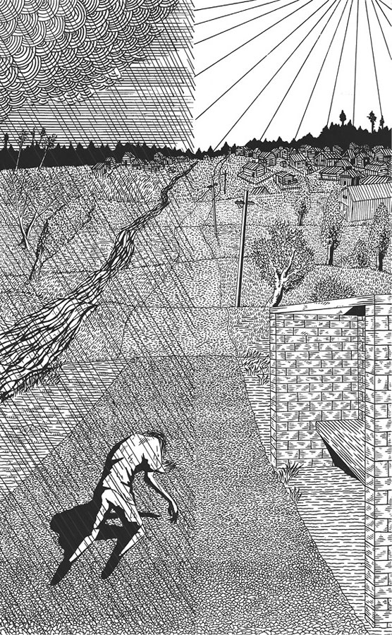 Инстинкт самосохранения не давал останавливаться. Только благодаря тому, что желал выжить, – а ведь я нутром чувствовал, что моей жизни угрожает настоящая опасность, – мне удалось вернуться к выезду из Гнезда. Увидев искаженное очертание кирпичной остановки за стеной ливня, я сделал усилие и переправился через барьер. Не совсем понял, как это произошло, но я будто вынырнул из вертикального водоема, переползая через черту, определенную погодной аномалией. Как только я оказался на той стороне, дождь прекратился…