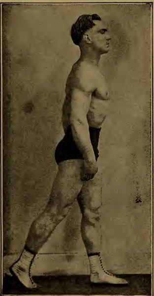 Правильная поза при ходьбе после достижения хорошей осанки вышеописанными методами. Положение головы является доминирующим фактором в правильной осанке. Голова должна быть поднята, а верхняя часть позвоночника прямая.