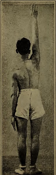 Другой план заключается в том, чтобы потянуться вверх и сжать руки за головой, при этом локти должны быть направлены вверх и назад. Стоя в этом положении, если вы теперь откиньте голову назад, вы увидите, что ваша грудная клетка расширена, позвоночник выпрямится и вся ваша осанка станет правильной. Это придаст вам положение, подобное положению солдата. Теперь вы можете опустить руки в стороны, но сохраняя то же положение позвоночника и результат будет идентичен идеальной осанке, которая достигается с помощью упражнений, стоя у стены.