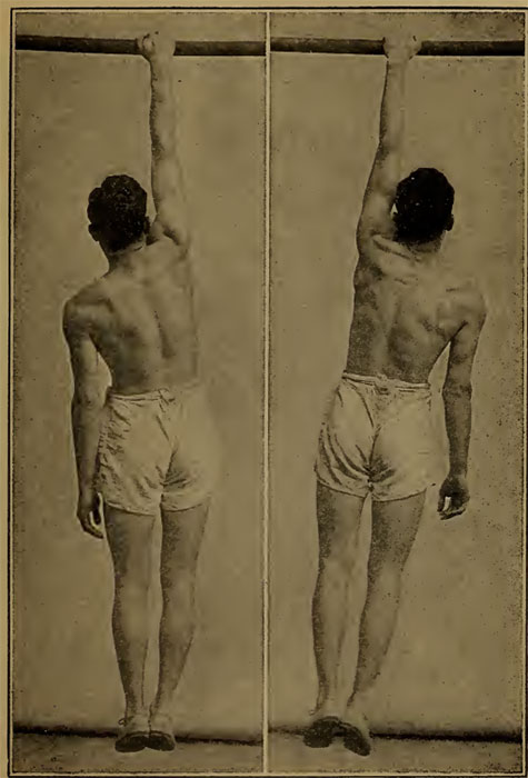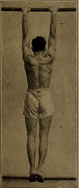 Постарайтесь установить перекладину или другую опору, с помощью которой можно подвесить тело по всей длине за руки, как на этой фотографии. В некоторых случаях верхняя часть створки двери может служить для этой цели. Это подвешенное положение является прекрасным для равномерного растяжения позвоночника.