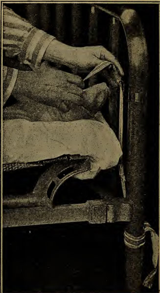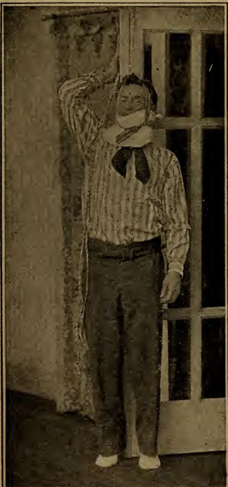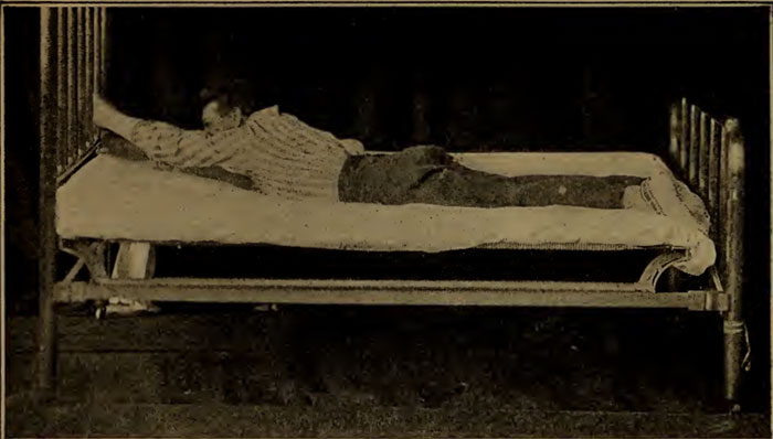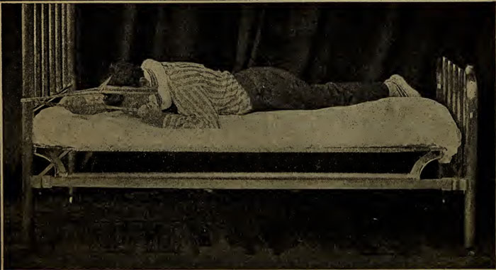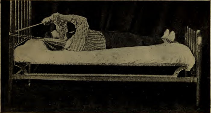 Это идеальный метод растяжки позвоночника, особенно верхней его части, с помощью изображенного на рисунке головного убора. Ноги закрепляются с помощью петли, а веревка, прикрепленная к головному убору, пропускается вокруг латунного столба у изголовья кровати. Растяжение позвоночника можно регулировать силой натяжения веревки. Не напрягайтесь. Это идеальное средство для облегчения состояния при сжатии хрящей и в значительной степени при вывихах и «подвывихов» спинных позвонков.