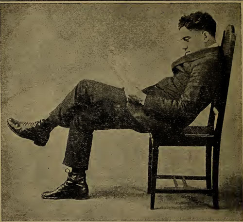 Это излюбленная американская сидячая поза, способствующая тесной груди, круглым плечам, согнутому позвоночнику, опущенным органам и общему нездоровью. В этой неправильной позе могут быть виноваты в значительной степени как наши плохо сделанные стулья, так как сам человек, который, естественно, сползает в эту позу, когда сидит на стуле такой конструкции. (См. следующее фото).