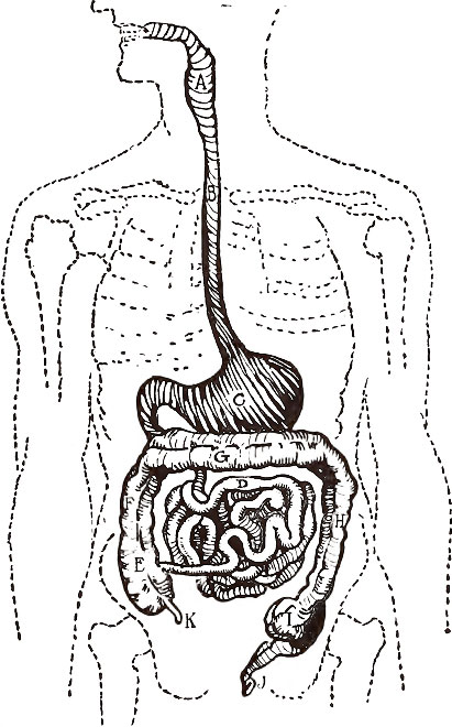 A – глотка; В – пищевод; С – желудок; D – тонкая кишка; Е – начало большой ободочной кишки, большой мешочек внизу – это слепая кишка; F – восходящая ободочная кишка; G-поперечная ободочная кишка; H – ободочная кишка; I-сигмовидный изгиб; J – прямая кишка и анальное отверстие; К – аппендикс.