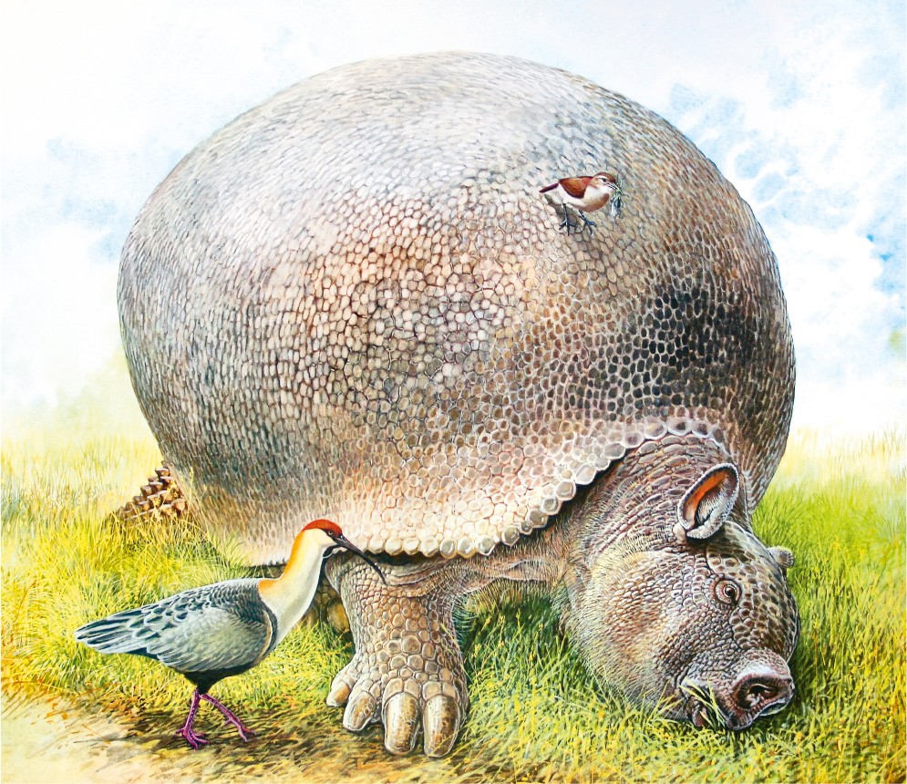 Глиптодон (Glyptodon clavipes) из Южной Америки. Птицы – рыжий печник, сидящий на панцире (Furnarius rufus), и белошейный ибис (Theristicus caudatus) – относятся к видам, дожившим до наших дней