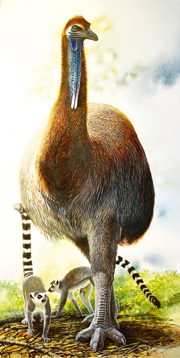 ИЛЛ. 1.1. ТЫСЯЧУ ЛЕТ НАЗАД НА ЮГЕ МАДАГАСКАРА. МАДАГАСКАРСКИЙ ЭПИОРНИС (Aepyornis maximus) идет мимо пары кошачьих лемуров (Lemur catta – вид, сохранившийся до наших дней). Птица весила, возможно, до 230 кг, а ее яйца были до 1 м в окружности. Не полностью окаменевшие остатки эпиорниса и его близкого родственника мюллерорниса (Mullerornis) (см. илл. 4.8) встречаются часто, следовательно, эти птицы были, вероятно, достаточно многочисленны. Некоторые пляжи на Мадагаскаре усеяны осколками скорлупы их яиц, это определенно означает, что эти птицы там гнездились. Возможно, эпиорнисы прожили достаточно долго, чтобы их образ, хоть и в очень искаженной форме, лег в основу легенды о птице Рух – сказку об этом диковинном существе Марко Поло привез в Европу в начале XIV в.