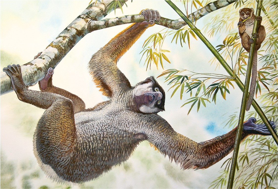 ИЛЛ. 2.1. ГИГАНТСКИЙ ЛЕМУР АРХЕОИНДРИ (Archaeoindris fontoynonti) был крупнейшим приматом Мадагаскара. Он мог весить до 160 кг, примерно как крупный самец гориллы. Остатков этого тяжеловесного животного найдено мало, поэтому многие подробности его образа жизни остаются неясными. Хотя у археоиндри были длинные руки, как и у его родственника меньшего размера – палеопропитека (см. илл. 7.6), остается неясным, вел ли он активный древесный образ жизни. Если да, то он мог «ходить» по деревьям, осторожно одну за другой переставляя конечности, как это делают современные орангутаны, причем по той же причине – несмотря на длинные руки и хватательный тип кисти, эти животные слишком массивны для быстрого передвижения на весу. Справа – сохранившийся до наших дней серый лемур (Hapalemur griseus), его вес весьма скромен – 2,5 кг.