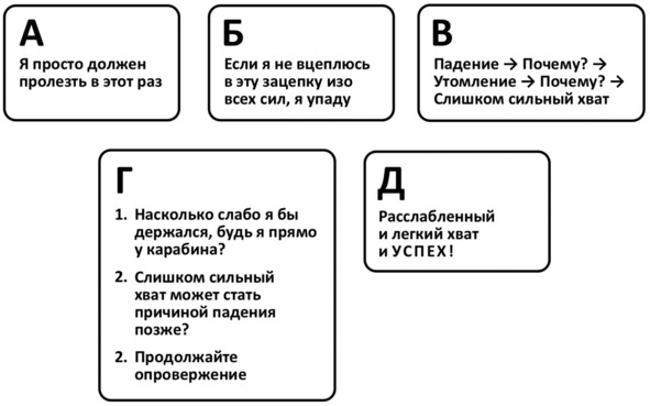 Завершу мыслью о преимуществах анализа затрат и выгоды. Да, сильный хват на зацепке может подстраховать вас на случай срыва ноги, но в то же время он может гарантировать ваше падение или неудачу на несколько зацепок выше. В конце концов придётся принять решение, что шансы на успех более велики, если хват ослабить, сдерживая страх падения и боли, и рискнуть оступиться – в обмен на вылезание трассы. Наконец, в завершение нас ждёт последний шаг – новый позитивный эмоциональный опыт.