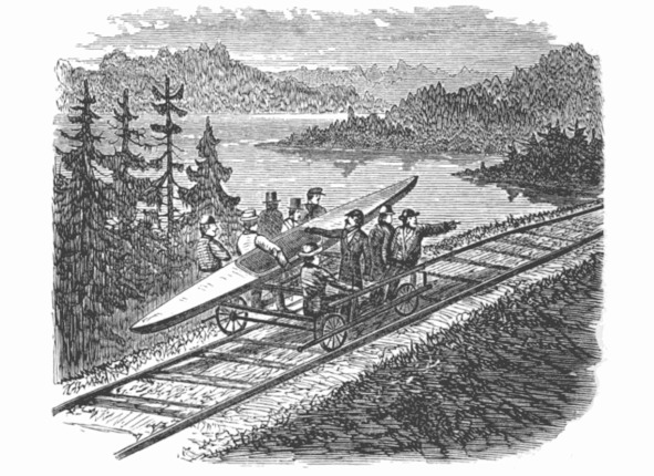 Но сейчас наша цель – не Гломмен, «Роб Рой» поплывет по более скромной реке. На следующее утро мы погрузились в дрезину, железнодорожную тележку, приводимую в движение рукоятками и педалями. На это транспортное средство цепляется столько людей, сколько может удержаться. Так мы и грохотали по рельсам, пока не достигли берега небольшого озера, из которого зимой вода переливается в Гломмен, а далее в Скаггерак, тогда как обычно вода вытекает на юго-восток и по длинному и извилистому пути попадает в озеро Венерн, а из него в Каттегат.
