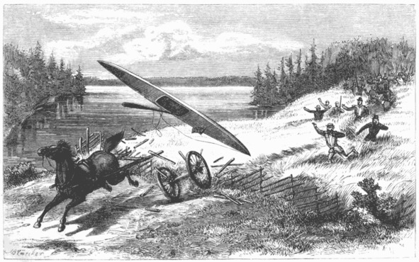 После угощения нашли телегу, мы погрузили на нее лодку отправились к другому озеру. И тут солдат-возница допустил оплошность, вовремя не придержав лошадь на спуске с холма и позволив двигаться слишком быстро. Напрасно я и все остальные кричали «Стой!»