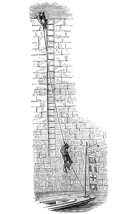 Вот вам и воскресные мысли… Когда день закончился, со мной случилось нелепое приключение, смешное и потому не вызывающее сочувствия, но все же достойное рассказа. Стоявший на якоре в гавани «Роб Рой» был привязан к причалу длинной веревкой, что позволяло в прилив подвести его к подножию вертикальной лестницы из железных скоб, вбитых в камни причальной стены – обычный здесь способ выхода на берег. Служащий на пирсе обещал присмотреть за лодкой, пока идет отлив, и оттянуть ее, чтобы она не обсохла до моего возвращения. Но когда я вернулся ночью, киль «Роб Роя» уже достиг дна, и сдвинуть яхту мы не могли. Вода ушла настолько, что никакая лодка не могла подойти к причальной стенке вокруг гавани. Я подождал час, надеясь, что начнется прилив; но в конце концов, нетерпеливый и сонный (хотелось продолжить путь на рассвете), решил как-нибудь добраться до яхты.