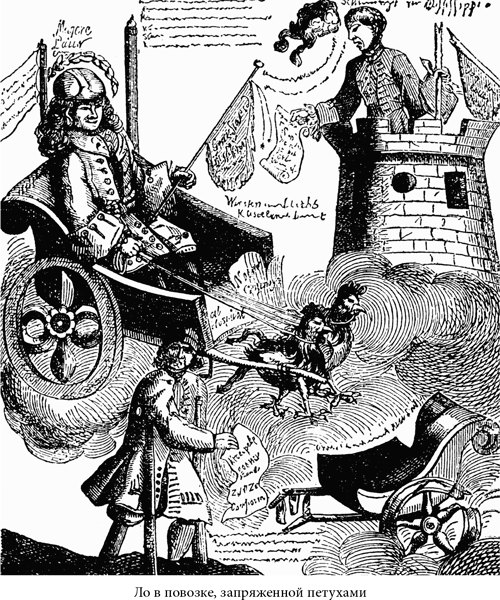 Lundi, j’achetai des actions;Mardi, je gagnai des millions;Mercredi, j’arrangeai mon ménage;Jeudi, je pris un équipage;Vendredi, je m’en fus au bal,Et Samedi, á l’hôpital[43].Среди множества опубликованных в тот период карикатур, явно свидетельствующих о том, что нация осознала всю серьезность положения, в котором она оказалась по собственному недомыслию, была одна, факсимиле которой сохранилось в «Мемуарах о регентстве». Подпись автора под карикатурой гласит: «Богиня Акций в своей триумфальной колеснице, которой правит богиня Глупости. В колесницу впряжены воплощения Миссисипской компании (с деревянной ногой), Компании южных морей, Английского банка, Компании Западного Сенегала и различных страховых компаний. Чтобы колесница катилась достаточно быстро, агенты этих компаний, которых можно узнать по их длинным лисьим хвостам и коварным взглядам, вращают спицы колес, на которых написаны названия ценных бумаг и их стоимость, меняющаяся в зависимости от поворотов колес. По земле разбросаны товары, бухгалтерские журналы и торговые гроссбухи, раздавленные колесницей Глупости. На заднем плане – огромная толпа людей обоего пола, всех возрастов и общественных положений, шумно требующих Фортуну и дерущихся друг с другом за долю акций, которые она щедро им раздает. В облаках сидит демон, выдувающий мыльные пузыри, также являющиеся объектами восхищения и алчности людей, запрыгивающих друг другу на спины, чтобы дотянуться до них, пока они не лопнули. Справа на пути колесницы, загораживая проезд, стоит большое здание с тремя дверями, через одну из которых она должна проехать, если проследует дальше, а вместе с ней и вся толпа. Над первой дверью написано “Hopital des Foux”[44], над второй – “Hopital des Malades”[45], а над третьей – “Hopital des Gueux”»[46]. На другой карикатуре Ло сидит в большом котле, варящемся на огне народного безумия и окруженном бурлящей толпой людей, бросающих в него все свое золото и серебро и радостно получающих взамен бумажки, которые Ло раздает им пригоршнями.