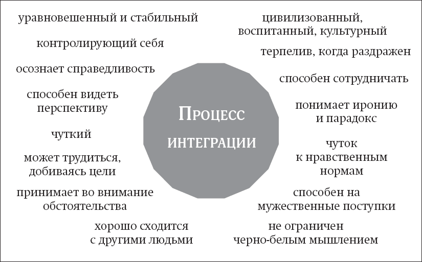 Одним из самых важных плодов интегративного процесса является способность быть отдельной личностью среди огромного множества других людей. Когда вы способны придерживаться своей собственной точки зрения, учитывая опыт другого человека, перспектива становится шире и глубже. Маленькие дети могут исходить только из одной точки зрения в момент времени, обычно они выражают это так: «Это мое». Зрелый же человек способен не соглашаться с кем-то, сохраняя при этом ощущение единения: «Я понял твою точку зрения, хотел бы ты услышать мою?» Кроме того, интеграция порождает самостоятельную личность, не поддающуюся давлению сверстников, слиянию с ними, имитированию или растворению друг в друге. Как сказала 7-летняя Кэти подруге во время игры: «Я не хочу быть твоим домашним крольчонком. Мне не нравятся кролики. Лучше я буду мамой-хомяком».