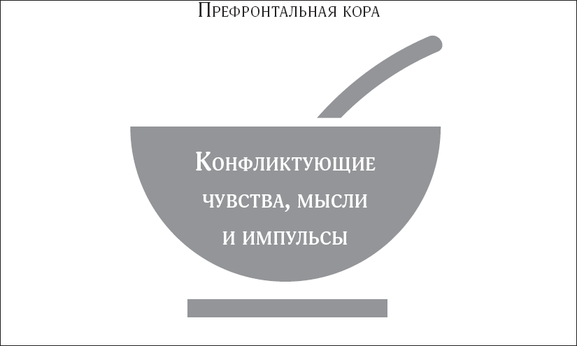 Когда правое и левое полушария будут достаточно развиты, префронтальная кора превратится в «чашу для смешивания» конфликтующих чувств, мыслей и импульсов. Обычно это происходит между 5 и 7 годами. Ребенок начинает испытывать внутренний диссонанс, и у него появляется совесть. Например, если раздраженный ребенок собирается бросить что-нибудь, у него может возникнуть конфликтующий или конкурирующий импульс, который скажет ему: «Не бросай, ты можешь сделать кому-нибудь больно». Если раньше его день проходил либо «хорошо», либо «плохо», теперь ребенок может сказать вам, что день прошел «и так и эдак». Теперь он может рассказать, что ему хотелось взять чужую вещь, но он не стал этого делать, потому что знает, что это плохо. Когда дети вступают в переход от 5 к 7 годам, у них появляется способность учитывать две стороны одного явления одновременно и сочетать две разных мысли.[39] Именно смешивание чувств и мыслей в префронтальной коре в конце концов тормозит неуравновешенные действия и порождает самоконтроль. Антидотом для сильных эмоций и импульсов оказываются конкурирующие сильные эмоции и импульсы – если их свести вместе, они производят парализующий эффект. Внутренний конфликт, созданный противоречивыми чувствами и мыслями, ставит энергию эмоций на паузу. Например, ответом на страх является желание, и это порождает мужество. Ответом на фрустрацию становится забота, и это порождает терпение. Когда чувствам и мыслям предоставляется достаточно места и их конфликт поощряется, начинается «поединок». Цель – сплести вместе эмоции и мысли, что приведет к более зрелому характеру.