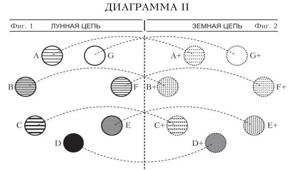 2. Эти сферы от A до G (на диаграмме I формируются процессом, называемым оккультистами «возрождением» планетных цепей. Планетная цепь (от A до G) образована именно семью сферами планеты. Когда седьмой и последний (на сфере G) Круг начинается, высшая (или первая) сфера А и с ней все другие в последовательности от A до F начинают умирать. Планетарное разложение (Пралайя) приближается. Каждая планета, следуя эволюционным путём, должна передать свою жизнь и энергию другой планете, как произошло в случае взаимодействие Луны и Земли (диаграмма II).