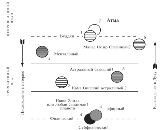 Для случая Земли, когда затрагивается состав человека, была принята шкала из четырёх низших планов проявленного мира и трёх – непроявленного; итого – семь (см. диаграмму I). Планета Земля в результате объединения нескольких волн эволюции состоит из семи сфер, подобных семи принципам (телам) человека. Любая планета, проходя последовательно фазы развития (на рис. 1 для Земли от 1 до 7), пробуждает к активности последовательно тот или иной принцип. При этом уже развитые ранее принципы остаются в том или ином виде активными.