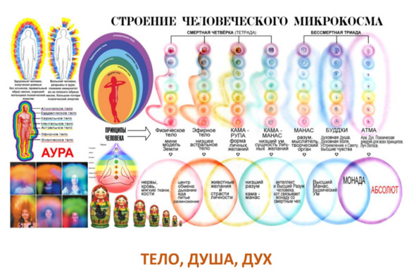 В Учении человеческое существо подразделяется на три основных начала – духовное, психическое и физическое, то есть на Дух, Душу и Тело (см. рис. ниже). Эти три основных начала расширяются до семи. Так, высший, или основной, СИНТЕТИЧЕСКИЙ принцип есть огненная энергия жизни или духа, разлитая во всем Космосе, требующая для своего фокусирования шестой принцип, или Буддхи (часто называемый духовной душой в отличие от человеческой – животной души), образуя таким образом монаду47, которая является первичным, несознательным воплощающимся Эго.