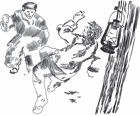 Старик лежал на спине и тяжело дышал, закрыв глаза. Из разрезанной под глазом щеки текла кровь: Сенька успел-таки полоснуть его бритвой. Я посадил его, прислонив спиной к столбу, кто-то принес воды. Рана была неглубокая, кровь удалось вскоре унять, и старик пришел в себя.