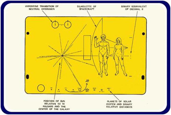 Это была копия того самого послания внеземному разуму, которое в 1972 году земляне отправили в межзвездное пространство на космическом корабле «Пионер». Левую часть занимало изображение звезды. Справа располагались две человеческих фигуры. Мужчина стоял, приподняв в приветствии правую руку.