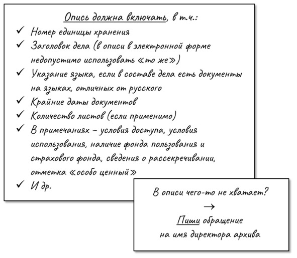 Все что можно предложить в данной ситуации – это писать жалобы и предложения о приведении описей в «рабочий» вид. Ссылайтесь на пункт «Правил…» приведенный выше. По крайней мере, количество листов и даты создания документов архив проставлять должен.