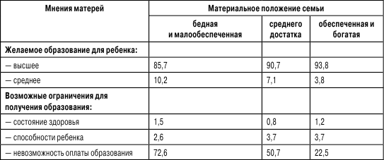 Конечно, среди обеспеченных лиц эта доля существенно ниже, но и в этой группе населения каждый пятый выражает тревогу по поводу возможных материальных проблем в связи с получением ребенком желаемого образования. В среднем более половины родителей (55,6 %) сомневаются, что в настоящих условиях ребенок сможет получить желаемое образование.