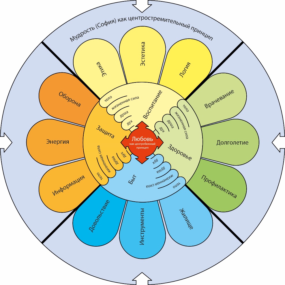 Таким образом, пространство экономики витальности описывается секторами быта, здоровья, воспитания и безопасности в единстве их материально-эфирной, душевной и духовной ипостасей, как это показано на схеме.