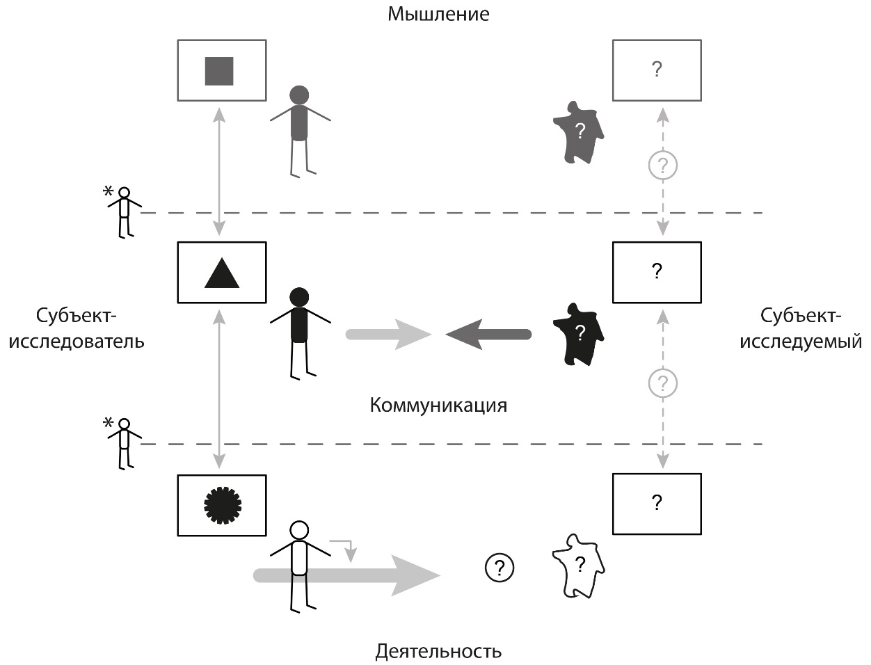 Субъект-исследователь должен научиться задавать вопрос субъекту-исследуемому, и научиться слышать и понимать ответ. Если рассматривать коммуникацию через призму методологии мышления и деятельности, то хорошо видно, как за словами и текстами стоят, с одной стороны, этажом выше – мышление, а с другой – этажом ниже – деятельность. В наиболее полном варианте коммуницировать можно не только в прямом диалоге, но и мыслями, и действиями, или видеть за речами мысли и поступки и соотносить их друг с другом: соответствуют ли слова мыслям, а действия словам.