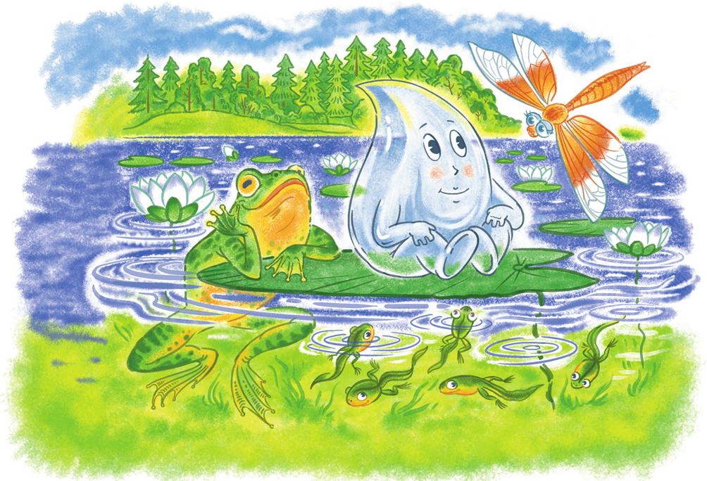 Однажды Капелька путешествовала по озеру, где познакомилась с весёлыми стрекозами, похожими на маленькие вертолёты. Потом она подружилась с лягушками и их детьми – головастиками: головастики были очень смешные, маленькие и чёрные, и у них было всего по две лапки. Когда головастики подрастут, то лапок будет уже четыре, а хвост потеряется. А там недолго стать и взрослой зелёной лягушкой, которая умеет замечательно квакать.