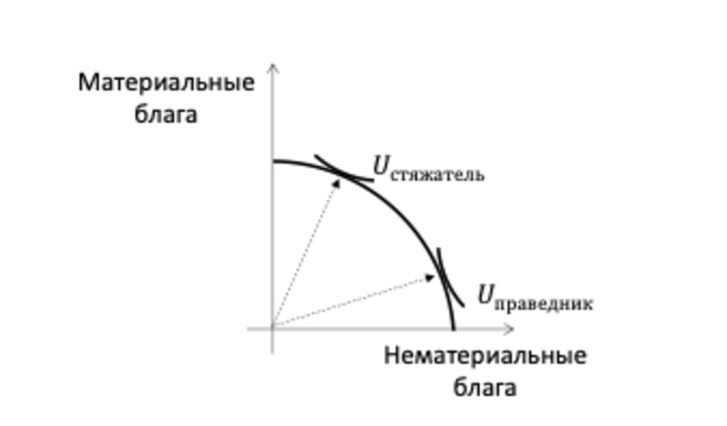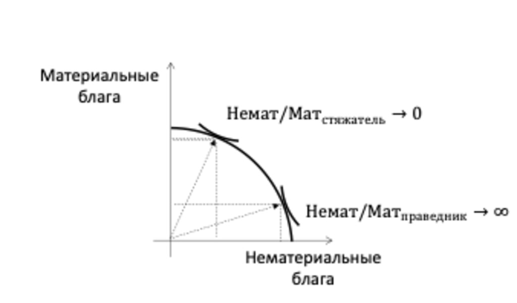 Количество нематериальных благ стяжателя минимально, а материальных максимально. В результате кривая его полезности в точке касания с кривой предложения благ почти горизонтальна. В этом случае величина Немат/Матстяжатель стремится к нулю. А кривая полезности праведника почти вертикальна, и отношение благ Немат/Матправедник стремится в бесконечность, поскольку он имеет минимальное количество материальных благ и максимальное количество благ нематериальных.