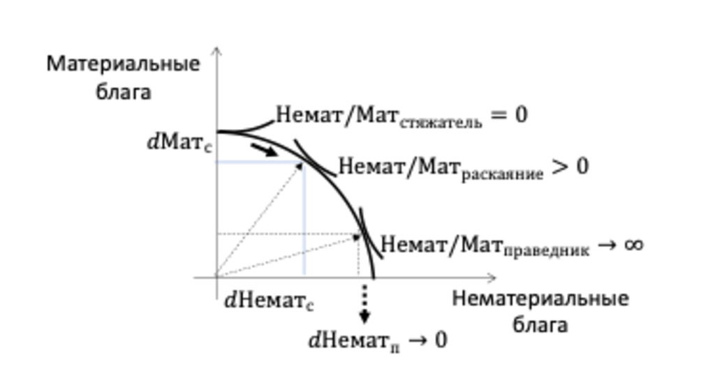 Предположим, что стяжатель раскаялся и решил отдать десятую часть своего состояния dМатс, как это предписывает Ветхий завет: «Отделяй десятину от всего произведения семян твоих, которое приходит с поля твоего каждогодно.» (Втор.14:22). В результате его привлекательность становится положительной Немат/Матраскаяние, и его полезность от суммы материальных и нематериальных благ возрастает. Полезность возрастает потому, и это видно на рисунке, что согласно тому же закону убывающей предельной полезности прирост нематериальных благ будет гораздо больше потери благ материальных или dНематс>dМатс. Альтернативная стоимость пожертвования, то есть, его нематериальная ценность, будет больше его материальной ценности.