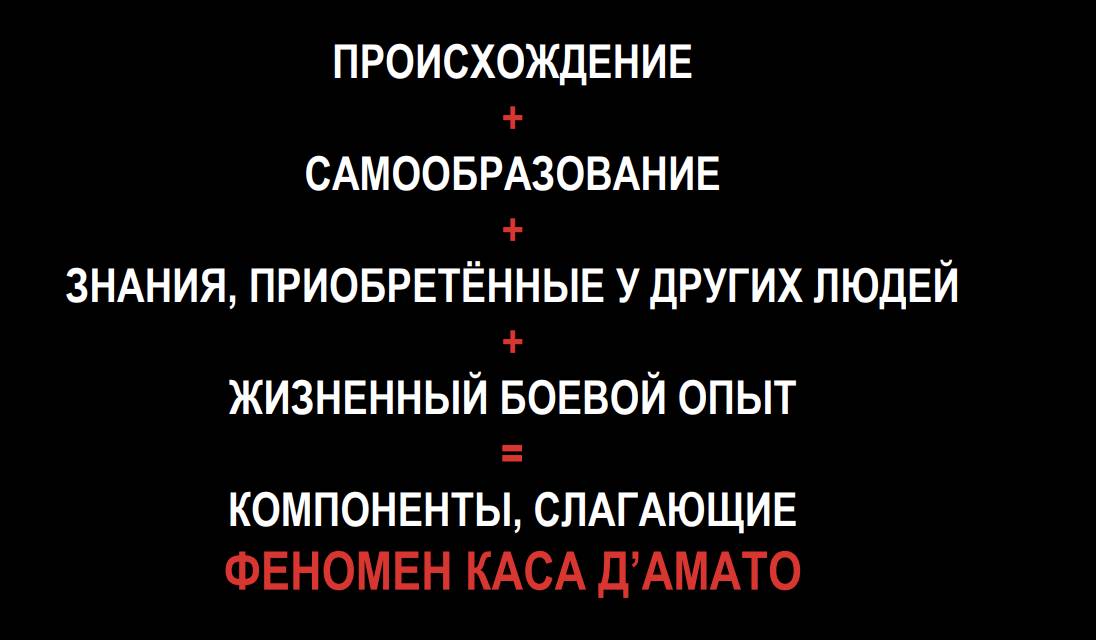Я бы разложил феномен на несколько частей. Первая часть – это происхождение Каса Д’Амато, та среда, где он вырос – его семья, его родовые корни; такие значимые события, как смерть старшего брата, другие многочисленные смерти на его глазах; конечно же, знаменитый поединок на ножах, на который оппонент Каса просто побоялся приходить; история о потере зрения на один глаз в уличной потасовке. Если вы хотите знать подробности и детали о происхождении Каса Д’Амато, для этого необходимо прочитать книгу доктора Скотта Вайсса, в ней подробно описаны эти многочисленные ситуации. Но, к слову, Том Патти говорит, что он слышал историю о потере зрения ни один глаз в 20-ти или 30-ти разновидностях, причём все – от самого Каса Д’амато. Каждый раз это была новая история… Зачем же давать ученику 20 вариантов одной истории? Пожалуй, дело в том, что настоящую причину Кас не захотел сообщить. Главное другое: когда мы говорим о потере зрения, о смертях – все эти ситуации непременно оставили неизгладимое впечатление и возымели определённое влияние на личность самого Д’Амато. Так, зрение Кас потерял, когда ему стоило убить противника, а он послушал своих друзей и не убил его. Тогда Касу очень сильно досталось… Друзья кричали: «Не убивай его, Кас!». И Кас не убил, но вместо этого – чуть не убили Каса, и он чудом остался жив. Тогда будущий тренер понял, что слушать друзей – это смерти подобно и что в следующий раз, послушай он друзей, его непременно убьют.