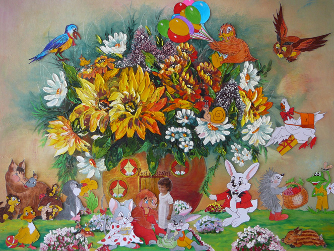 Страусёнку с недавних пор очень нравилось рисовать красками. Вот и в это утро он вынес мольберт в сад, разложил краски и принялся за своё любимое занятие. Надо сказать, что рисунки получались у Страусёнка всё лучше и лучше, а сегодняшний ему особенно удался. В это время Гусёнок, с устало-безразличным видом прогуливавшийся по саду, подошёл поближе и, как обычно презрительно сморщив клюв, стал разглядывать работу Страусёнка.