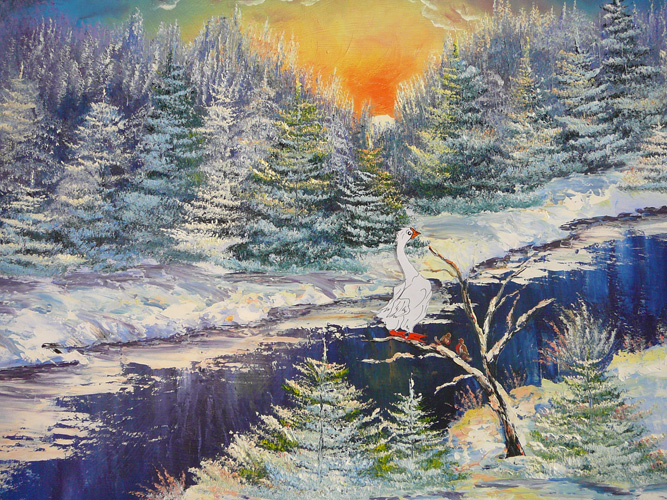 Гусь незаметно выбрался из-под сосны, перелетел на соседнюю поляну, а оттуда отправился прямо к реке, уже начинающей покрываться льдом. Взлетев на одиноко стоящее сухое деревце на берегу, Гусь долго любовался зимним закатом, ожидая прихода Гусиного Вдохновения и настраиваясь на поэтический лад.