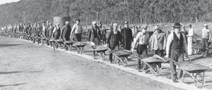 Основная часть нововыпущенных долларов пошла на финансирование массовых общественных работ. Миллионам безработных предлагалось за символическую плату трудиться на строительстве дорог, плотин, парков, мостов, школ, аэродромов. Силового принуждения по гулаговскому типу к этим почти бесплатным рабочим не применялось, однако экономические механизмы в условиях всеобщей безработицы действовали крайне эффективно. Разный по уровню жестокости, но сходный по организационным механизмам, лагерный труд стал важной составляющей экономической политики 1930-х и в США, и в Германии, и в СССР.