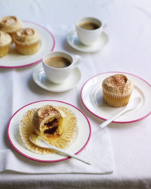 8. Fill each hollow to about halfway with the mascarpone cream, then place the cut-out pieces of sponge back on top of the hole, covering the filling and, if necessary, trimming the sponge pieces to fit. Lastly, frost the cupcakes with the remaining mascarpone cream and dust lightly with cocoa powder.