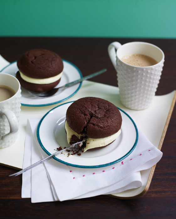 6. To assemble the whoopie pies, spread about 1 tablespoon of the filling on to the flat side of one sponge, adding a little more if needed. Place another sponge (flat side down) on top to make a sandwich, then assemble all the remaining pies in the same way. Dust with icing sugar to serve.