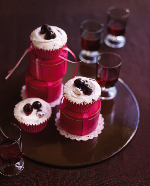 Sour Kirsch-soaked cherries give these cupcakes a fruit flavour that is fresh yet rich at the same time. The soaked cherries can be bought in tins or jars from large supermarkets.