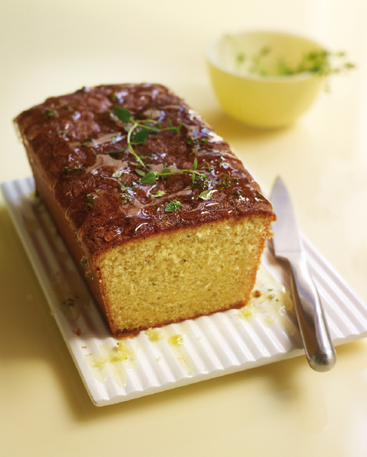 6. After adding the syrup, allow the loaf to cool a little in the tin, then transfer to a wire rack to cool completely before serving. Decorate with a couple of sprigs of lemon thyme.