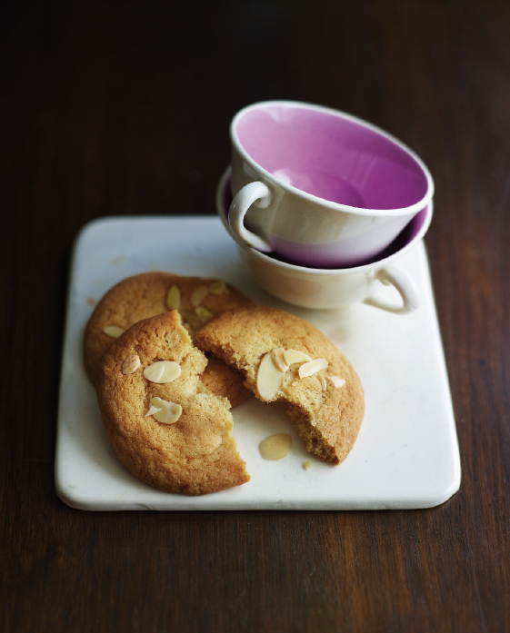 5. Press a sprinkling of the flaked almonds on top of each cookie ball, then place in the oven and bake for 15–20 minutes or until a light golden brown in colour. Allow to cool for 10 minutes or so on the sheets before transferring to a wire rack.