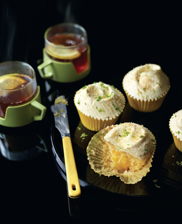12. Once the cupcakes are cool, use a sharp knife to make a hollow in the centre of each cupcake, approximately 2cm (¾in) in diameter and about 3cm (1¼in) deep. Retain the cut-out piece of sponge. Spoon about 1–2 teaspoons of the creamy lime curd into the hollow. Replace the cut-out piece of sponge, trimming to fit and pressing down gently to ensure that the top is level with the rest of the cake.