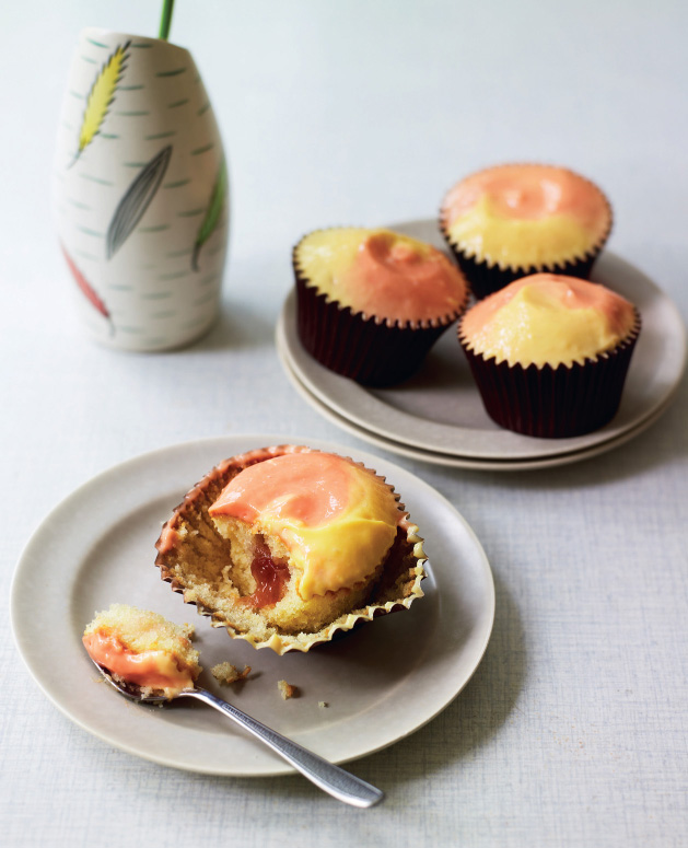 13. When the cupcakes are cool, use a sharp knife to make a hollow in the centre of each cupcake, approximately 2cm (¾in) in diameter and about 3cm (1¼in) deep. Retain the cut-out piece of sponge. Spoon 1–2 teaspoons of the rhubarb filling into the hollow. Replace the cut-out piece of sponge, trimming to fit and pressing down gently to ensure that the top is level with the rest of the cake.