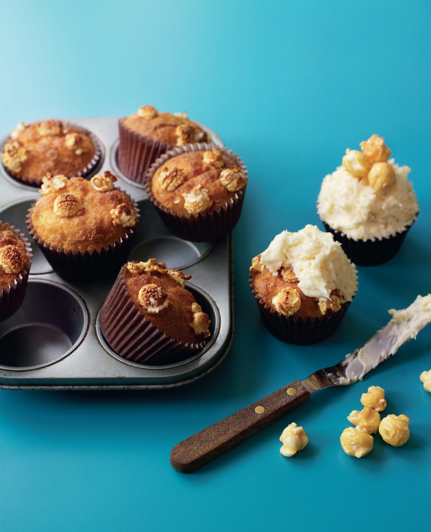 5. Spoon the batter into the prepared paper cases, filling them two-thirds full. Using a 50ml (1¾fl oz) ice-cream scoop can make this process easier and will result in even cupcakes. Place four pieces of popcorn onto each unbaked cupcake. These will bake into the sponge.
