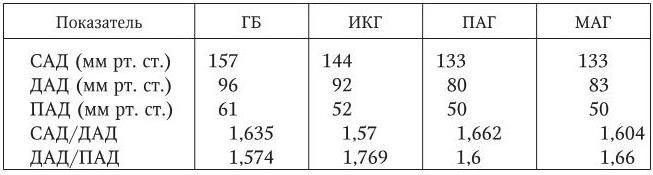 Анализ полученных данных показал, что, несмотря на различные уровни АД при разных формах гипертензии, отношения САД/ДАД мало чем отличались друг от друга и были близки к пропорции ЗС. Это указывает на синхронное повышение систолического и диастолического давления у больных с разными формами гипертензии. Соответствие отношений ДАД/ПАД пропорции ЗС отмечено у больных ГБ, ПАГ и МАГ. Только у больных ГБХ наблюдалось более выраженное отклонение этого отношения от ЗС (9 %). Оно вызвано несинхронным повышением ДАД по сравнению с САД, что способствовало уменьшению ПАД.