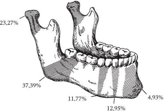 Рис. 2. «Места слабости» и частота неогнестрельных переломов нижней челюсти по локализации