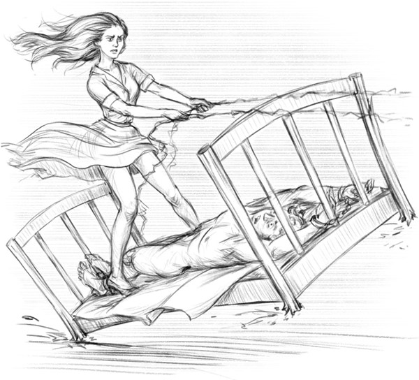 И первый сгусток энергии ударяет в стену, пробивая ее. Ложе вместе с нами едет к окну. Я натягиваю аркан на себя, пытаясь задрать изножье кровати. Постель широкая. Но окно тоже. Мелькнувшее опасение «не пройдем!» в прямом смысле отметается. Взрывной волной. Она-то и выносит часть стены. А еще – нас: меня, кровать и привязанного к ней ошалевшего рыжего карателя, который, судя по его воплям, десять раз пожалел, что не умер.