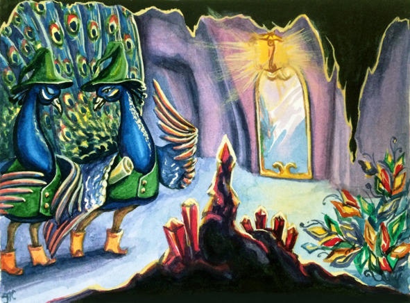 Павлины настолько были влюблены в себя, в свой внешний вид, в свою красоту, в правильность своих действий, что окружили себя со всех сторон зеркалами и всем тем, что имеет свойство отражения, дабы никто не смог нарушить их хрустальной веры в их превосходство и их божественную красоту. Жители провинции светлых дел жили под землёй, так как боялись, что яркое солнце сожжёт цвет с их перьев и перья утратят красу. Павлины жили среди сталактитов и сталагмитов. Их жилища и весь город освещали огненные человечки из братства Огня, принимаемые на работу по тщательному конкурсному отбору, проводимому в несколько этапов самим дражайшим императором провинции светлых дел. Представители братства Огня были очень похожи на маленьких человечков, из всего туловища имеющих лишь одну голову, на которой вместо волос пылал яркий огонь, маленькие ручки и ножки под ней.