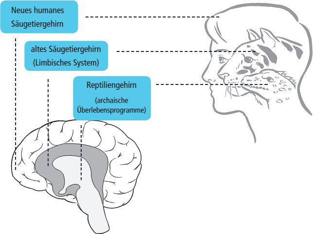 Noch heute kann man die Entwicklungsstufen im Gehirn erkennen. Grundlegende Systeme bestehen schon seit der Zeit der Dinosaurier. Diese Hirnstrukturen sind bei uns und zum Beispiel Eidechsen noch immer ziemlich ähnlich aufgebaut. Nennen wir diese Anteile das „Dinosaurier-Gehirn“. Es regelt überlebensnotwendige Funktionen wie Atmung, Schlaf, Durst, Hunger und Körpertemperatur, aber auch grundlegende Reaktionen auf angenehme und unangenehme Reize, auf Bedrohung und zudem die Sexualität. Hier können wir heute noch ticken wie ein Dino.